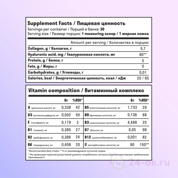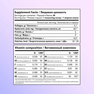 Пептидный говяжий коллаген, гиалуроновая кислота, витамин С (аскорбиновая кислота), витаминный премикс ((витамин B3 (ниацин), Е (альфа-токоферола ацетат), В5 (кальция пантотената), В12 (цианкобаламин), В6 (Пиридоксин гидрохлорид), В1 (тиамина мононитрат), А (ретинола ацетат), В2 (рибофлавин), В9 (фолиевой кислоты), D3 (холекальциферола),В7, (биотин)), ароматизатор, сукралоза (менее 0,02%).Противопоказания: индивидуальная непереносимость компонентов, беременность и ГВ. Перед применением проконсультироваться со врачом. Не является лекарственным средством. Есть сертификат Халяль.
