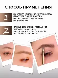 Откройте тинт. Наберите необходимое количество скошенной кистью продукт с аппликатора на руку или рабочую поверхность, прорисуйте брови, закройте крышку до щелчка.