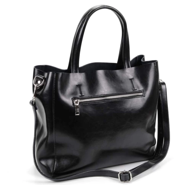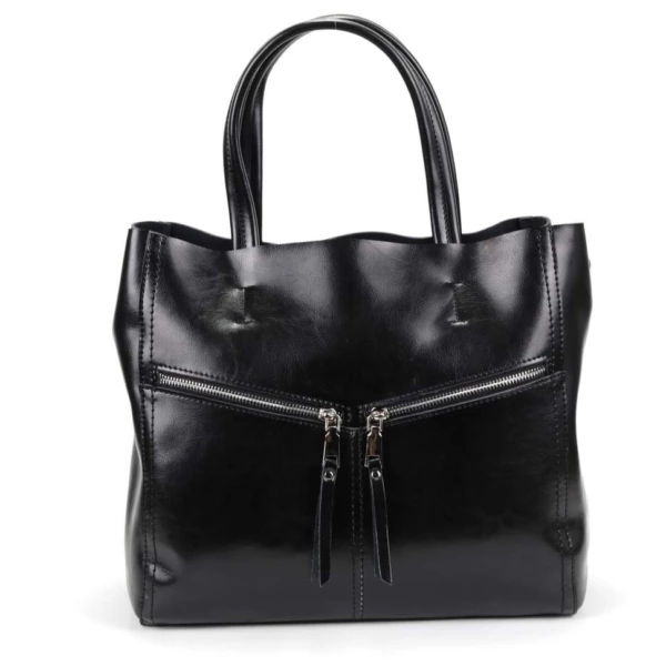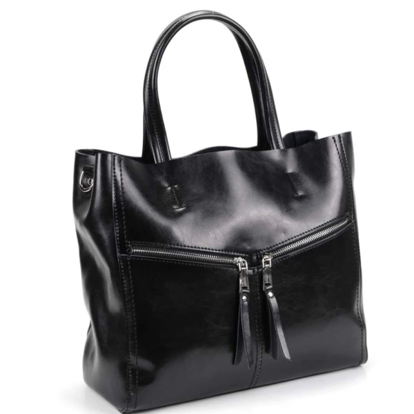 Женская сумка из натуральной гладкой кожи черного цвета. Высота ручек 18см. Снаружи, на лицевой стенке есть два кармашка на молниях. Сумка закрывается на металлическую молнию. Внутри отделение разделенное карманом на молнии по середине и боковые кармашки, один на молнии и два открытых. Снаружи, на задней стенке есть кармашек на молнии. На дне сумки металлические ножки. В комплекте регулируемый по длине наплечный ремень. Сумка вмещает формат А4.