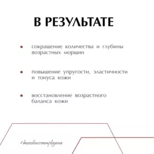 Нежный крем с обволакивающей текстурой на основе жидкокристаллической эмульсии тройного омолаживающего действия – разглаживающий эффект, борьба с морщинами, улучшение цвета лица. Ультрасовременный комплекс активов повышает тонус кожи, замедляет процесс старения, стимулирует синтез коллагена, защищает коллаген и эластин от разрушения, ускоряет обновление клеток, интенсивно увлажняет кожу, оказывает мощное антиоксидантное и ранозаживляющее действия, регулирует деятельности сальных желез. Крем является универсальным завершающим средством, лифтинг-кремом для возрастной кожи или для комплексного восстановления проблемной кожи. быстро впитывается, не оставляя пленки на коже; подходит для активного образа жизни; не имеет ограничений использования в период активного солнца или отрицательной температуры.
