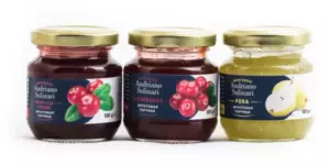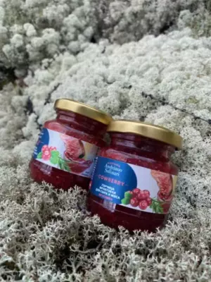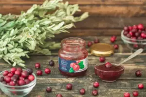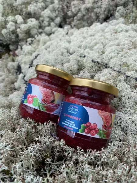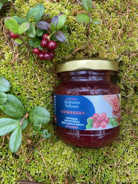 Изысканный остро-сладкий горчичный соус из брусники с ягодами.