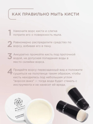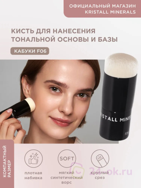 Кисть Кабуки имеет мягчайший ворс плотной набивки. Благодаря этому, кисть обеспечивает равномерное нанесение минеральной базы или тональной основы, как рассыпчатой, так и компактной.