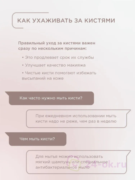 Для набора прессованных текстур опустите кисть вертикально ворсом вниз и мягко промокните ее по поверхности компактного продукта. Одного движения достаточно: так продукт не будет пылить. Легкими постукивающими движениями удалите излишки с ворса и приступайте к нанесению.