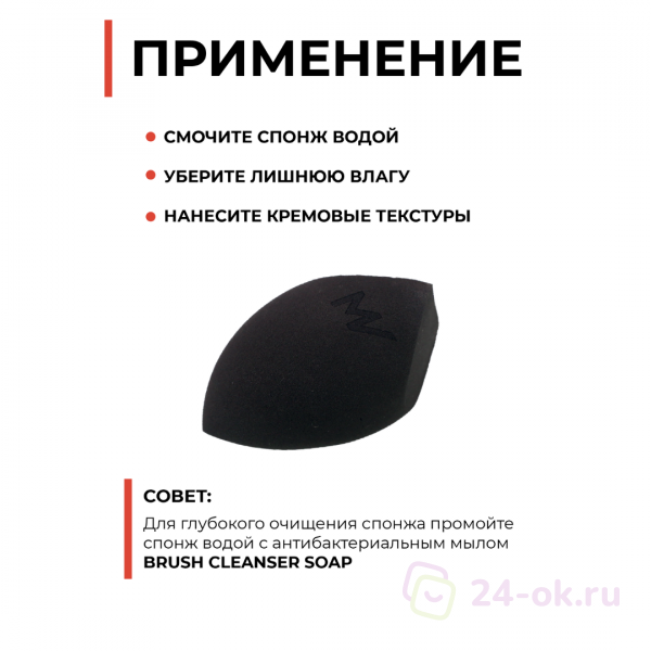 Используй разные грани спонжа, чтобы тщательно проработать труднодоступные участки, такие как зоны у переносицы, под глазами и т.д.Для более легкого нанесения рекомендуется смочить спонж водой и отжать лишнюю влагу.
