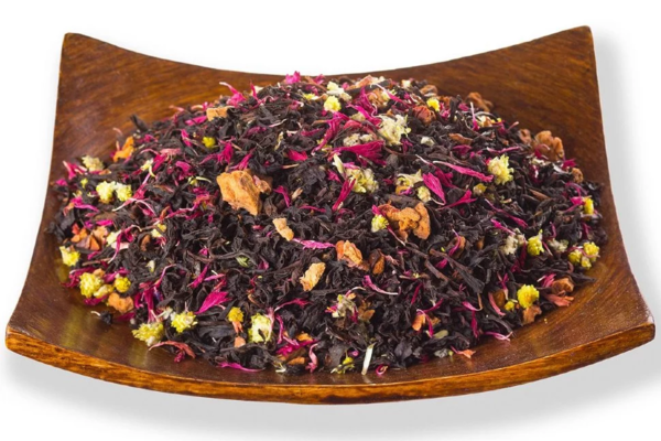 Состав: Черный цейлонский и индийский крупнолистовой чай, лепестки граната, цветки бессмертника, кусочки груши. С добавлением натурального ароматизатора груши и граната.