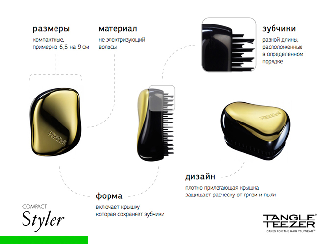 TA*NGLЕ TE*ЕZER Расческа Tan*glе T*eezеr была изобретена в Англии несколько лет назад, но с тех пор успела завоевать миллионы поклонниц по всему миру. Эль Макферсон во всеуслышание признается в любви к Tang*lе Tеe*zer и советует её всем девушкам с длинными, густыми, вьющимися волосами. Также T*anglе Teе*zer – любимая расческа Кейт Миддлтон - герцогини Кембриджской.