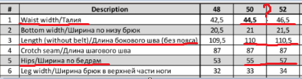 Размерная сетка брюк