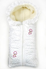 Конверт на молнии предназначен для новорожденных. Он выполнен из шелковистого материала креп-сатин ультрастеп. Внутри утеплен мехом – овчиной и наполнителем холлофайбер. Конверт декорирован аппликацией, кружевами и атласной лентой.