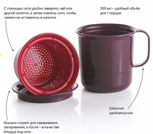 Чтобы чай сохранял вкус и аромат, его пьют свежезаваренным. Именно для тех, кто ценит такую возможность и не хочет пить остывший чай, создана эта заварочная кружка. Конструкция её проста и в то же время продумана до мелочей, как и у всей посуды Tupperware. Основные детали — сама кружка, фильтр, крышка.