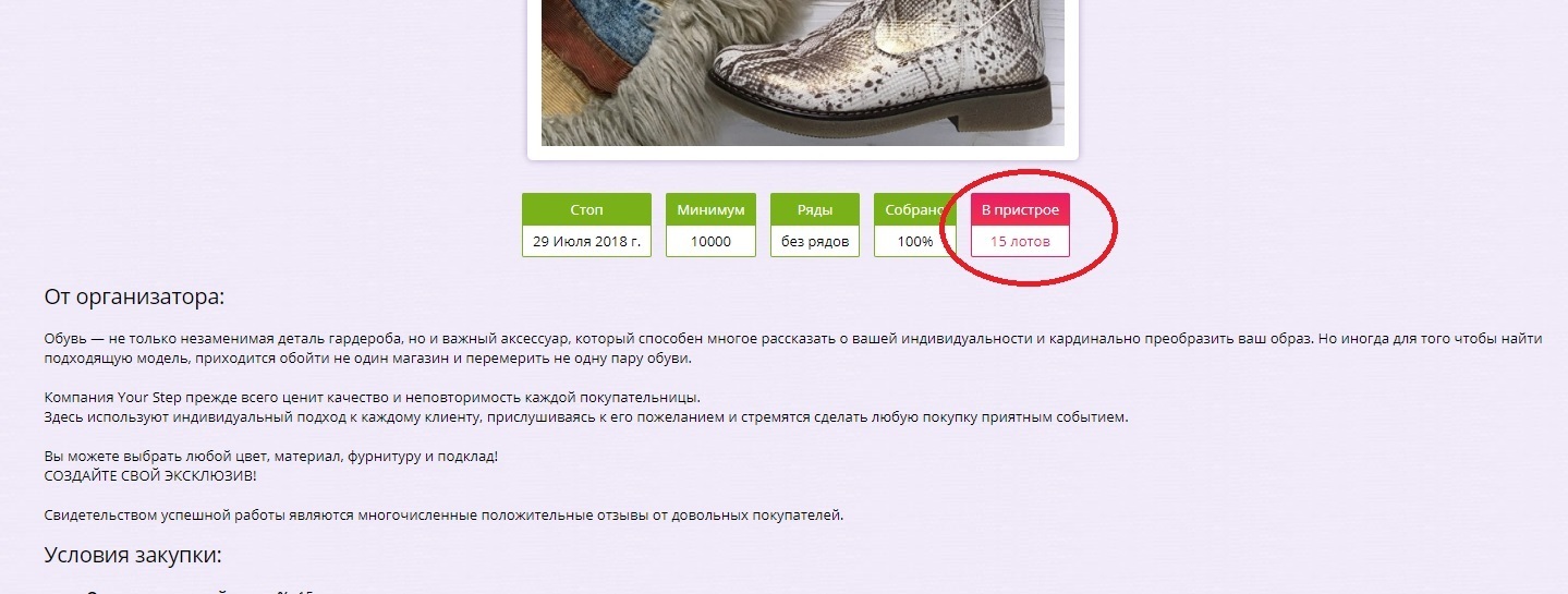 Другие условия Другие условия: 1. Из зафиксированных позиций не выписываю, бронь поставщику могу отправить в любое время. Учитывайте это. В корзину кладите только то, что готовы выкупить. Для выбора понравившихся моделей добавляйте в "мои желания".2. Вся обувь отшивается под заказ в необходимом вам цвете, материале (также можно выбрать вариант, как на фото), сезоне и размере. Сроки пошива 14-20 рабочих дней при наличии всех комплектующих.3. Можно выбрать подклад для своей обуви: сезон деми – байка. Зима - набивная овчинка. «Подклад козочка для зимы» - чуть выше стоимость данных моделейЕсть возможность заказать себе обувь из  «эксклюзивной кожи» -расцветки данной кожи представлены в каталоге.4. В зависимости от курса цены могут меняться как в меньшую, так и в большую стороны.ЗАКУПКА НЕ БЫСТРАЯ, С МОМЕНТА ОКОНЧАНИЯ ОПЛАТ ДО ПРИХОДА ГРУЗА ОРИЕНТИРОВОЧНО 2 МЕСЯЦА (ТОВАР ПРОХОДИТ ЧЕРЕЗ ТАМОЖНЮ, ВОЗМОЖНЫ ЗАДЕРЖКИ).