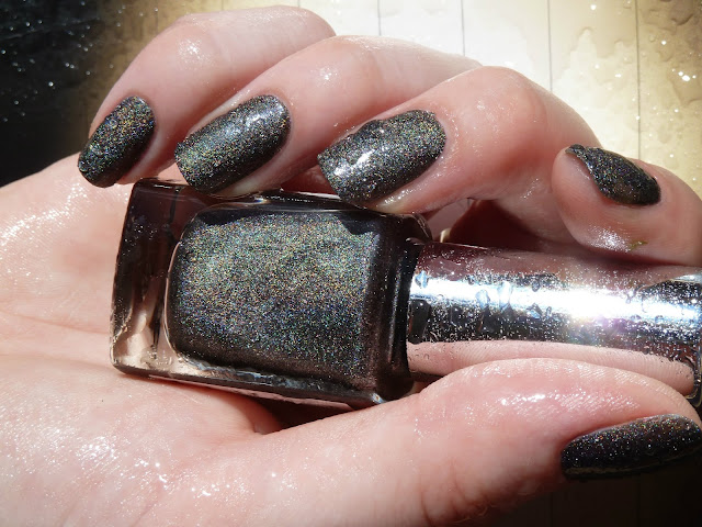 Рассеянная голография на темно-сером фоне, словно капли дождя на асфальте, лак многогранен, может раскрыться радугой на теплом солнышке, а может стать сдержанным в тени. Когда я нанесла его впервые, не могла оторвать взгляда от ногтей целый день, очень загадочный=) По качеству лак отличный, легко наносится, довольно быстро сохнет, долго держится, кисть средняя удобно прокрашивает лунку и весь ноготь. Наносить лучше в два слоя. Единственное -но- мне не хватает его собственного глянца, поэтому сверху использую топ (на фото без), тогда голография раскрывается в полной мере.
