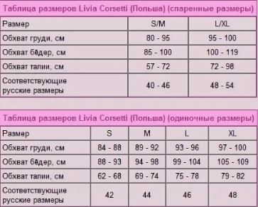 Добрый день. Размерная сетка Livia Corsetti, Польша