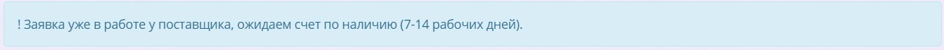 Заявка уже в работе у поставщика (дозаказы/замены из-за особенностей сбора товара НЕВОЗМОЖНЫ). Счет выставляют через 7-14 рабочих дней.