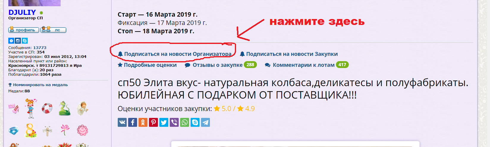 Фиксирую заказы за 2 дня до стопа из зафиксированного не выписываю! В случае если у вас до момента фиксации не выбран ни один из возможных раздающих цр (все варианты в 1 сообщении) я отправляю ваш заказ в центр раздач вашего района .Иногда некоторые позиции неприходят, их я переношу в следующую сп.в доставку включаю довес продукции.развоз по пятницам.НЕ несу ответственности за полуфабрикаты отправленные межгородом. Всю продукцию коптят в ночь, утором она остывает и сразу к нам. К нам всегда приходит только свежее. Картинки скачаны из интеренета.Они приближены к реальности.Сосиски у поставщика толстые, не как на картинке. Буду стараться выложить в каталогах фото в реальности.Если бывают форс мажоры, то раздачу переношу на субботуДрузья,нажимайте на сердечки рядом с лотами! Подписывайтесь на закупку