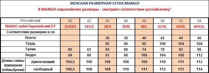 Добавила размерную сетку! Смотрите внимательно в MANGO -немецкие размеры (как утверждает посредник), в MANGO outlet -европейские