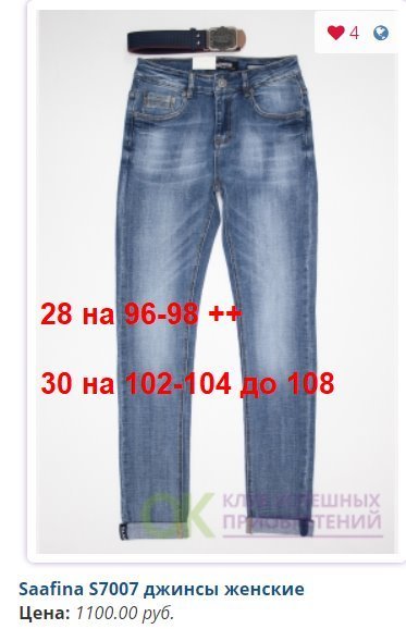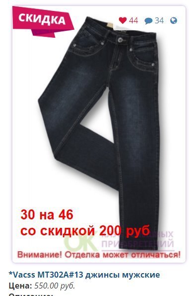- Скидка предоставляется за счет Участников, занявших самые востребованные размеры: в женских моделях - 27, 28, 29, 30; в мужских - 31,32,33,34,35,36,38..... И Конечная стоимость джинсов для них будет больше на 30-50 рублей.