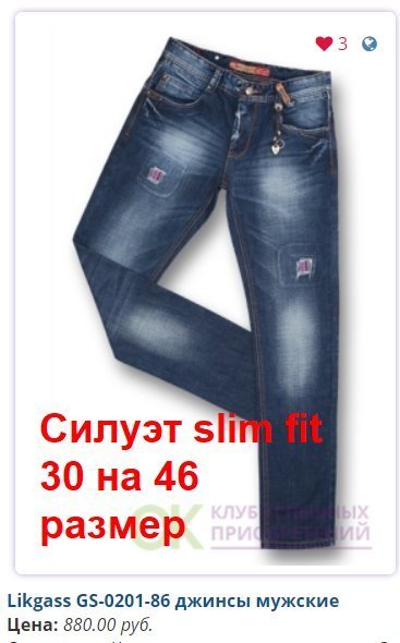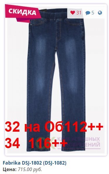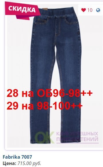 - Скидка предоставляется за счет Участников, занявших самые востребованные размеры: в женских моделях - 27, 28, 29, 30; в мужских - 31,32,33,34,35,36,38..... И Конечная стоимость джинсов для них будет больше на 30-50 рублей.