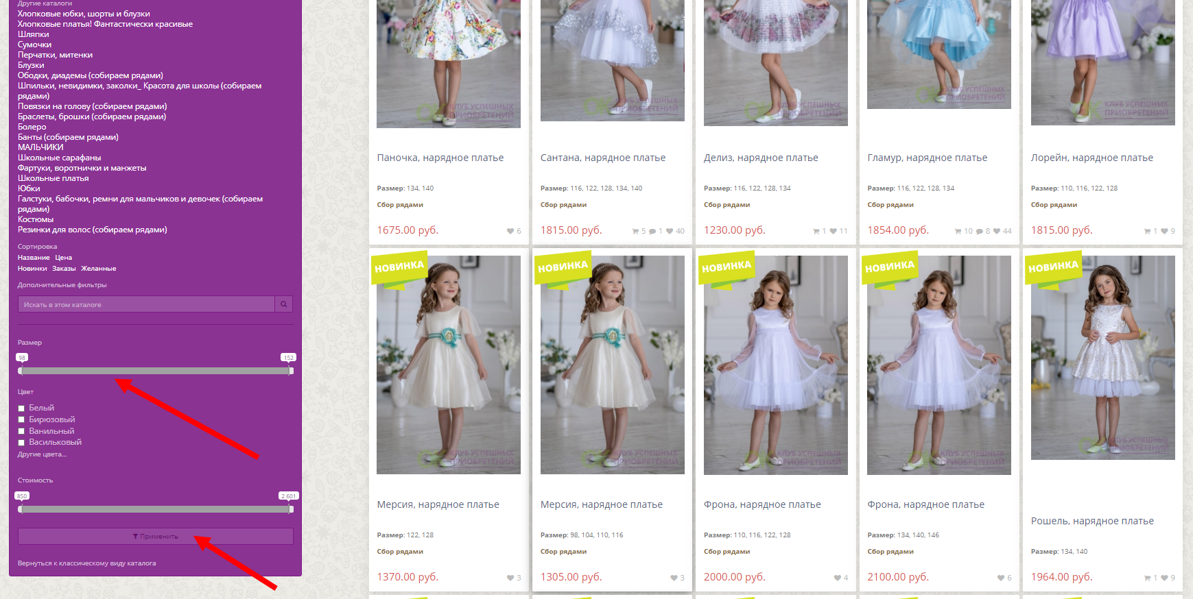 Очень удобно сортировать по размеру) а также можно поставить выборку по самой желанной модельке, по- макимальному числу выкупов и новинки)