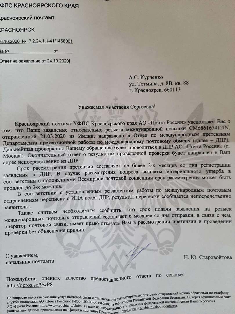 Заявление на розыск посылки на почте лежит. Как только будут новости, я вам сообщу