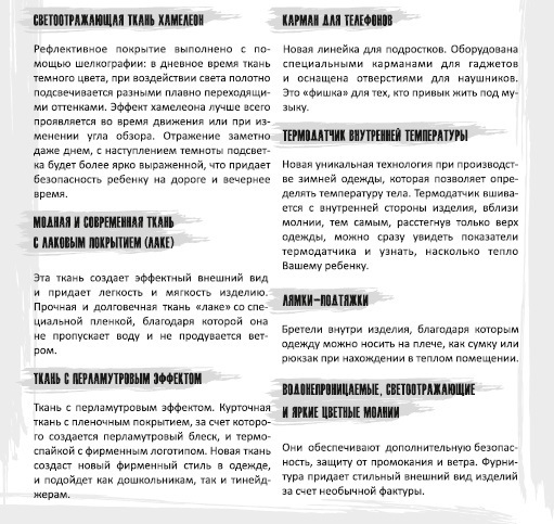 - Возможность регулирования объема и роста курток, брюк, капюшонов по нужному размеру