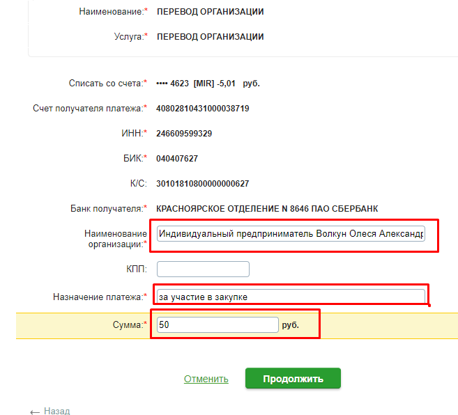 В наименовании организации пишем "Индивидуальный предприниматель Волкун Олеся Александровна", в назначении платежа пишем "за участие в закупке", и вводим сумму. Далее подтверждаем платеж. В отписке об оплате на сайте указываем ФИО полностью!!!
