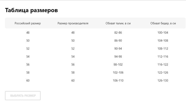 Подскажите где посмотреть таблицу размеров?