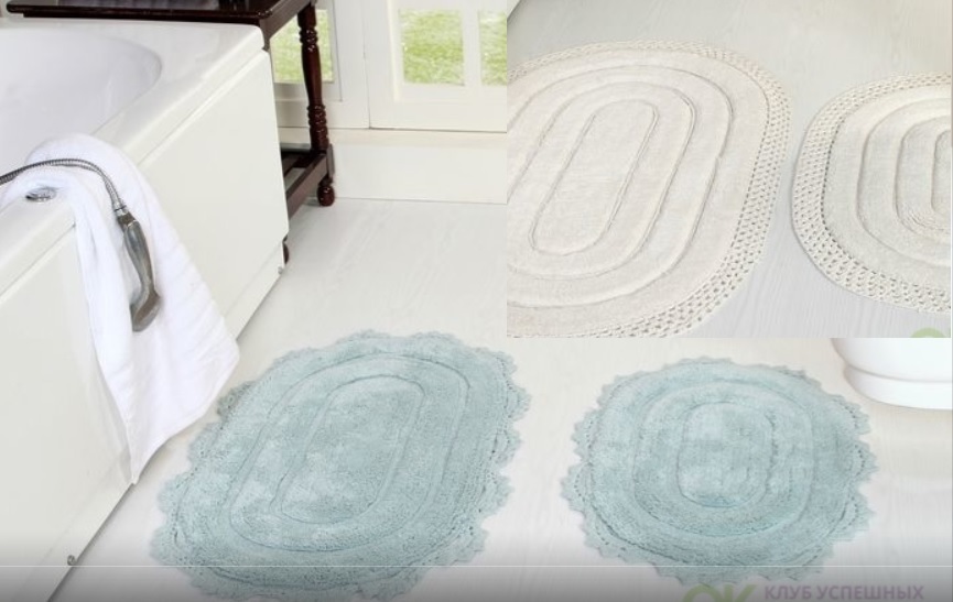 Коврики для ванной KAZANOV.A. изготовлены из плотной, и в то же время необычно мягкой хлопковой пряжи. Верхняя сторона имеет рисунок, нижняя сторона плетённая, и не даёт коврику скользить на плитке. Благодаря сверхвысокой плотности ноги как будто утопают в коврике. Они отлично впитывают влагу и устойчив к истиранию. Коврики украшены плетённым в ручную широким хлопковым кружевом. Их можно стирать в стиральной машине и они не теряют форму и цвет. Коллекция представлена в постельных тонах: кремовый, молочный, бежевый, пудровый, латте, крем-брюле, аква/ Упаковка: брендированный картонный блистер с вешалкой, ПВХ пакет.