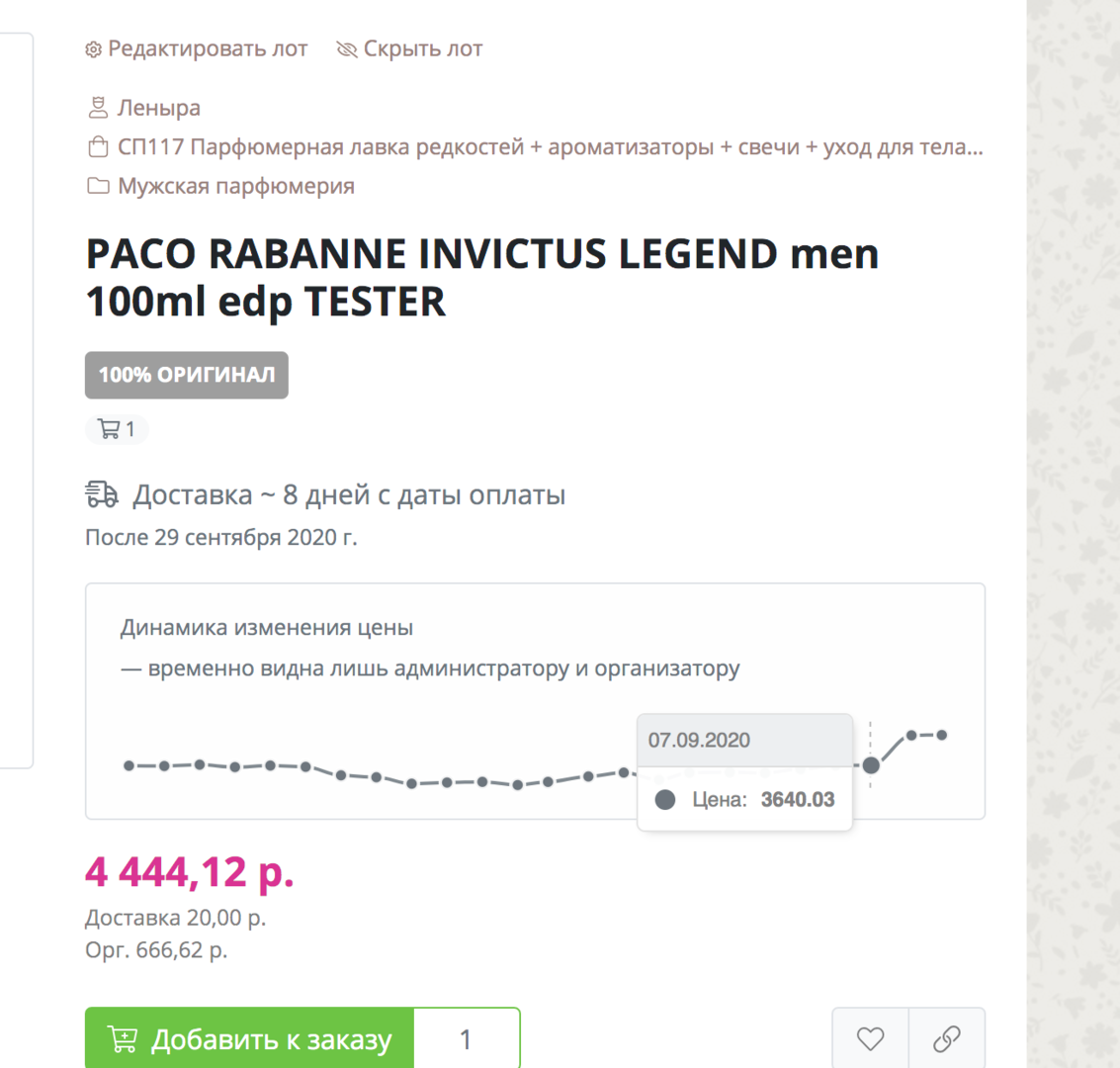 Леныра, Я согласна с тем, что не досмотрела на изменение цены, т.к. обычно слежу только за статусом заказа. Но так или иначе изменение цены выше верхней планки присутствует и логично было бы отправить какое нибудь уведомление или сообщение, чтобы человек обратил внимание, т.к. это нарушает Ваши же условия закупки. Если честно, в первый раз сталкиваюсь с такой ситуацией. Если Вас не затруднит, не могли бы Вы предоставить скриншот или другую сопоставимую информацию о цене на 17.09.20?