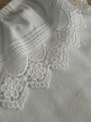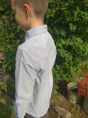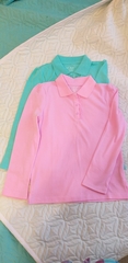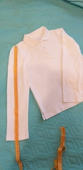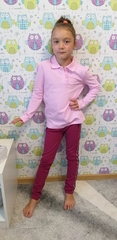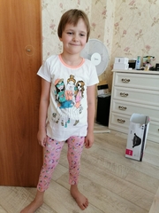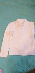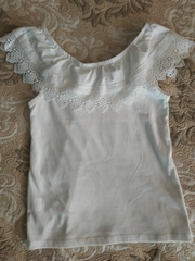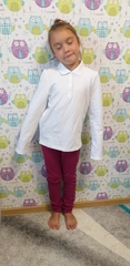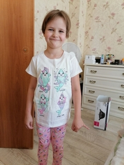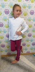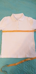 Белое поло. Размер так же 7/8 М, модель ростом 125 см. Состав ткани и качество аналогичное розовом и бирюзовому, но размерности идет явно больше. Рукавчик присборен по окату и он шире. Будет лежать на вырост.)