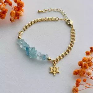 Аквамарин – в переводе с латинского означает «морская вода», получил своё название благодаря схожести с замерзшей каплей воды. Этот полудрагоценный камень относится к семейству берилла, состоит из множества маленьких кристаллов и, несмотря на свою твердость, достаточно хрупок. Встречается от голубых до зеленых цветов, подвержен воздействию солнечного света и температур.