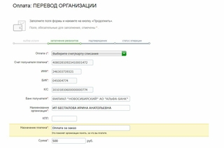Вводите последовательно: ИНН, р/счет и БИК, основание платежа "Оплата за заказ" и свою сумму оплаты, подтверждаете кодом из смс.