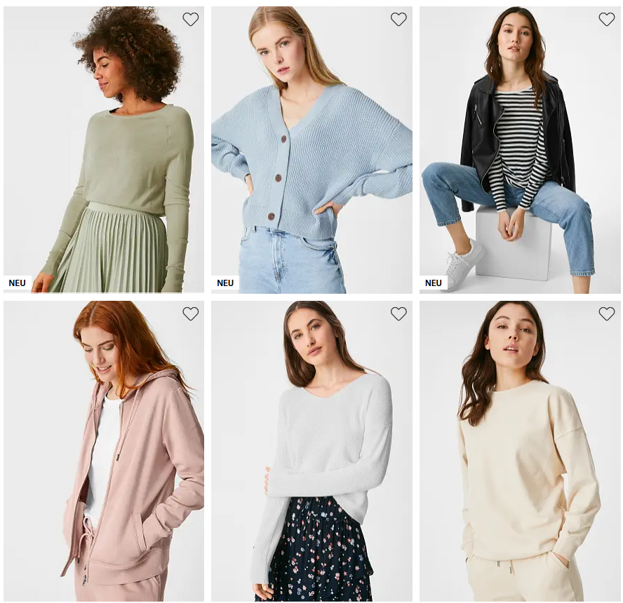 С&A — это разнообразная одежда для покупателей всех возрастов. Здесь каждый, от мала до велика, сможет выбрать одежду по своему вкусу, индивидуальности и настроению. Роскошные вечерние наряды и комфортная одежда для отдыха, классические костюмы для работы в офисе и одежда для малышей — все это есть в C&A по чрезвычайно демократичным ценам.