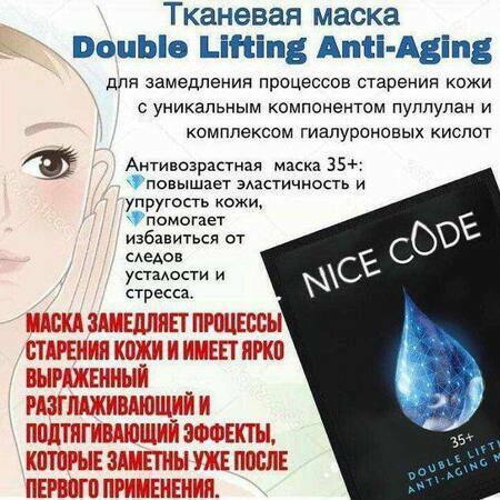 🔸Тканевая маска Nice Code Double lifting обладает интенсивным антивозрастным воздействием, повышает упругость кожи, сокращает глубину морщин, осветляет и выравнивает тон.
