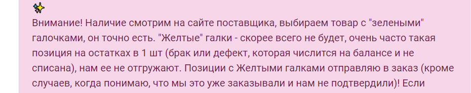 Внимание! Наличие смотрим на сайте поставщика, выбираем товар с "зелеными" галочками, он точно есть. "Желтые" галки - скорее всего не будет, очень часто такая позиция на остатках в 1 шт (брак или дефект, которая числится на балансе и не списана), нам ее не отгружают. Позиции с Желтыми галками отправляю в заказ (кроме случаев, когда понимаю, что мы это уже заказывали и нам не подтвердили)! Если позиция не выкупается, перенесу ее в следующий выкуп, будем ждать отшив