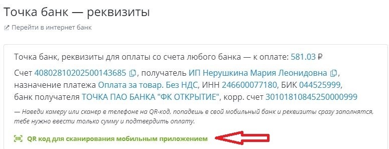 Nathaly, Здравствуйте, инструкция по оплате в банк Точка по QR-коду: 1. В корзине под заказом нажмите "Выбрать способ оплаты" 2. Выбираете "Точка банк", нажимаете " QR код для сканирования мобильным приложением", откроется QR код. 3. Открываете мобильное приложение своего банка. 4. Находите в разделе платежи - оплата по QR-коду 5. Нажимаете и сканируете QR-код, у вас появится платеж с заполненными реквизитами, вам остается ввести сумму и подтвердить оплату. 6. Перевод с ЛЮБОГО банка для вас БЕСПЛАТНО. 7. Не забудьте отписаться об оплате у нас на сайте, в комментарии к оплате на 24-ОК укажите последние 4 цифры номера телефона, привязанного к карте плательщика (для идентификации оплаты)