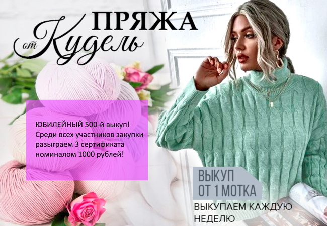 У нас стартовал юбилейный 500-й выкуп в закупке: Пряжа от Кудель! Дорогие мои, хочу сказать вам СПАСИБО!Спасибо за доверие, за Ваш талант и золотые ручки, за отзывы и фото, которые вы оставляете! Мне безумно приятно быть чуточку причастной к вашим творениям! И мне хочется порадовать вас! В 500-й закупке среди участников разыграю 3 сертификата номиналом 1000 рублей.Для участия в Розыгрыше достаточно: